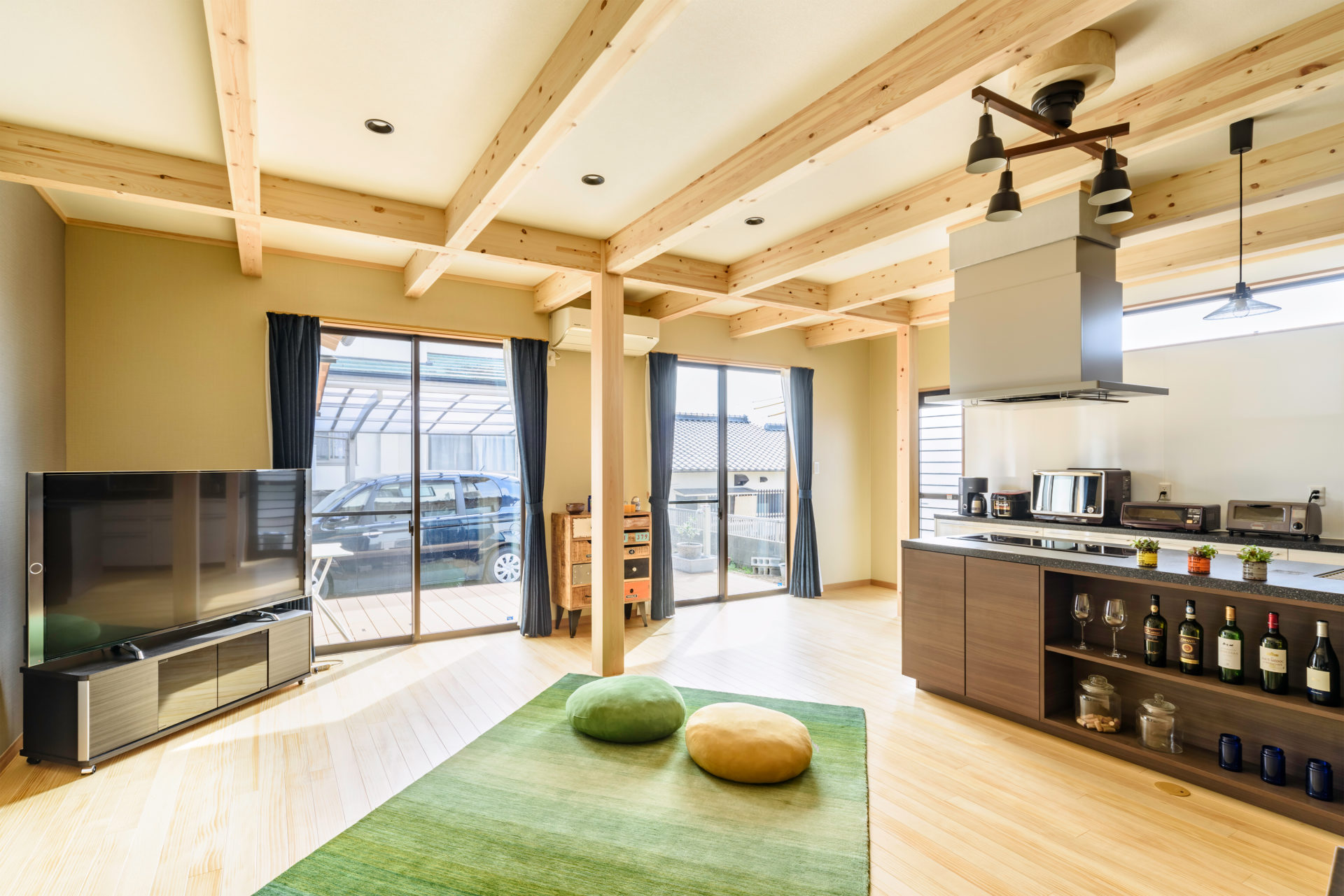 シックな木目のアイランドキッチンが存在感のあるリビング。 梁見せ天井で温かみを。キッチンが中心となり料理を囲むのが楽しくなるような空間です。 窓から太陽の光がたっぷり入り、とっても明るいとこも魅力です。