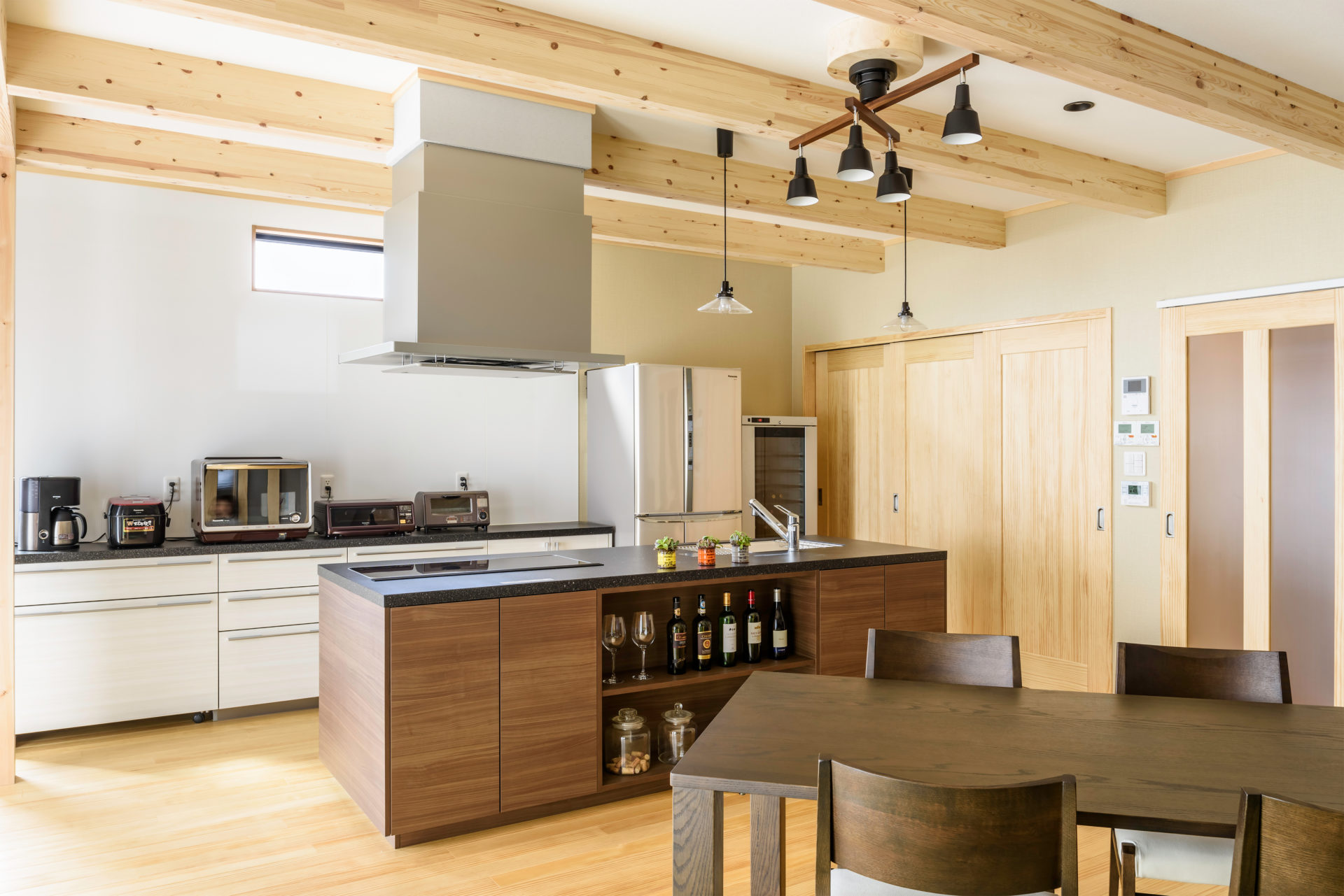 シックな木目のアイランドキッチンが存在感のあるリビング。 梁見せ天井で温かみを。キッチンが中心となり料理を囲むのが楽しくなるような空間です。 窓から太陽の光がたっぷり入り、とっても明るいとこも魅力です。